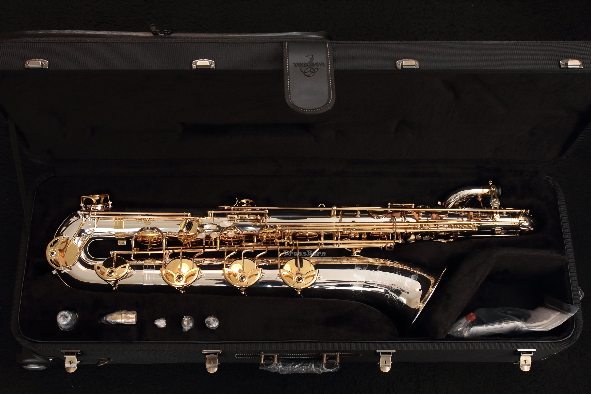 You will receive a mint unused Yanagisawa B-WO30BSB Solid Silver Elite Professional baritone saxophone with integrated peg mount and two adjustable multi-part floor pegs. This complete Yanagisawa retail kit includes the mouthpiece, ligature, neck, maintenance accessories, neck strap, and wheeled Yanagisawa baritone case. It comes with a Yanagisawa warranty for Japanand the price includes UPS Ground shipping to